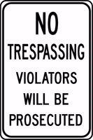 NO TRESPASSING VIOLATORS WILL BE PROSECUTED Sign - 18" x 12" .080 Reflective Aluminum. Engineer Reflective (RA)- Economical prismatic sheeting provides better day and nighttime brightness than traditional beaded engineer grade sheeting. This micro-prismatic retroreflective sheeting is recommended for commercial sign applications as well as non-critical traffic control signs, regulated by the MUTCD.Meets ASTM D 4956 Type I. Heavy-duty .080" Aluminum Signs will not rust. Reflective sign face provides added visibility in low-light conditions. UV-resistant inks prevent fading during long-term outdoor use. Supplied with top and bottom center holes for post or fence mounting. Traffic, Roadway, Street Signs & More