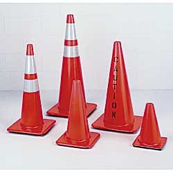 Traffic cones are constructed of one-piece vinyl for all-weather durability and reliability in any traffic or construction situation. Fluorescent, fade-resistant color. High-density, black PVC base. 1200 psi tensile strength; 250 psi tear strength. High heat resistance. Stackable. Engineered to meet USA MUTCD specifications. (Reflective collared models required for night time use.) NOTE: Model 7535702 has (1) 6" collar. Models 7535902 and 7536002 have (1) 6" collar and (1) 4" collar.